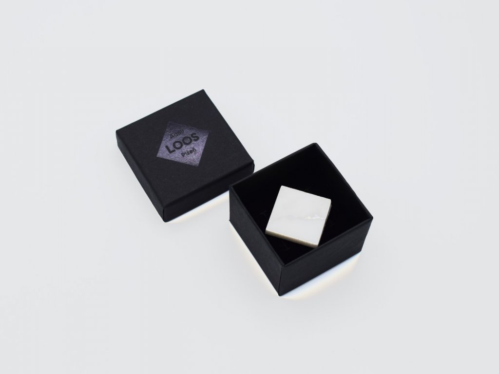 Brože mají rozměr 25 x 25 mm a jsou zabalené v černé dárkové krabičce s logem Adolf Loos Plzeň.