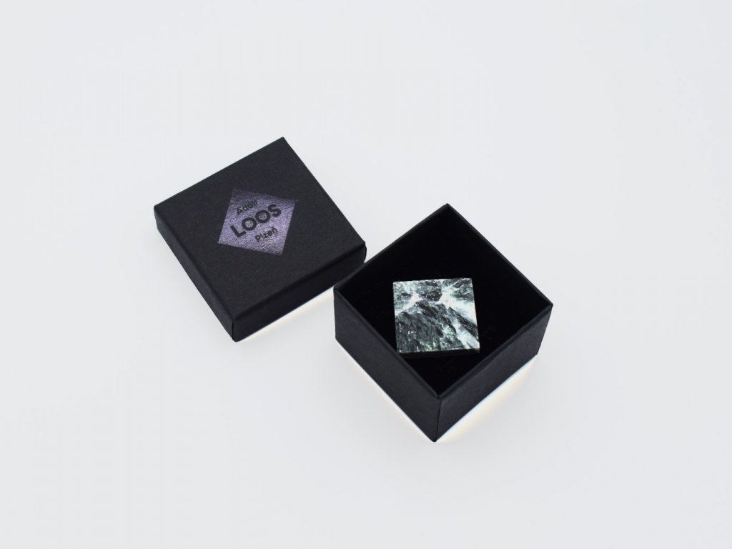 Čtvercové brože s jednoduchým zapínáním jsou vytvořené ze surového kamene stejného typu, který byl použitý v Loosových interiérech v Plzni, a jsou k mání ve třech provedeních: