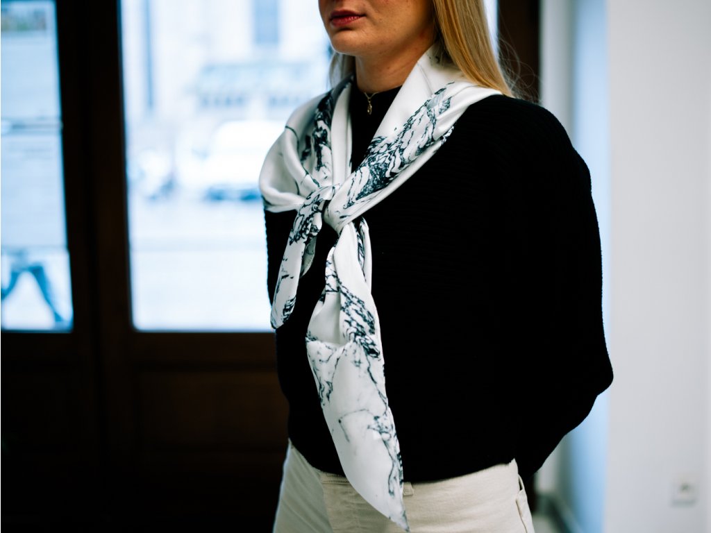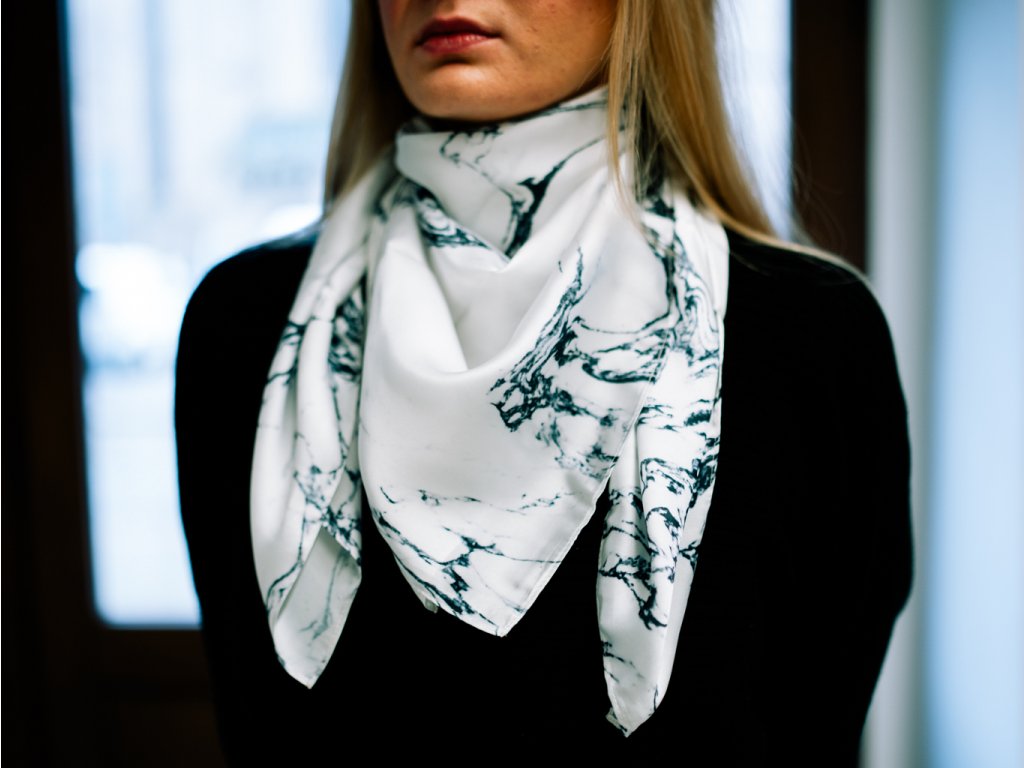 Stylový šátek inspirovaný mramorem fantastico z hudebního salonu bytu Huga Semlera na Klatovské 19. Nadčasový doplněk, který pozvedne jakýkoli outfit.